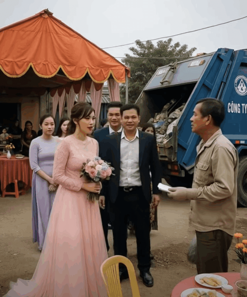 Đúng lúc ấy, từ xa, tiếng động cơ xe tải vang lên. Một chiếc xe tải cũ kỹ, bốc mùi rác, từ từ tiến vào con đường dẫn đến sân cưới. Mọi người quay lại, kinh ngạc. Trên xe, ông Hùng bước xuống, trên tay cầm một chiếc hộp gỗ cũ kỹ, bám đầy bụi.
