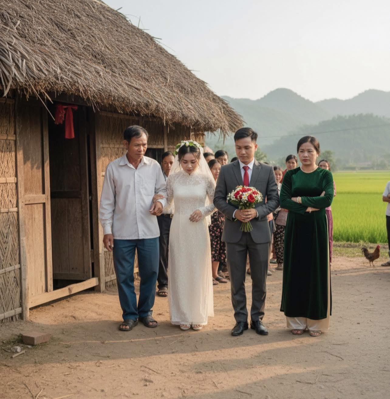 Linh hít một hơi thật sâu. Tiếng xì xào, tiếng cười khẩy của họ hàng nhà trai như xát muối vào tim. Cô nhìn cha — người đàn ông gầy gò, bộ áo sơ mi cũ sờn vai vẫn cố mỉm cười động viên con. Đôi mắt ông đỏ hoe, nhưng ông chỉ khẽ nói: