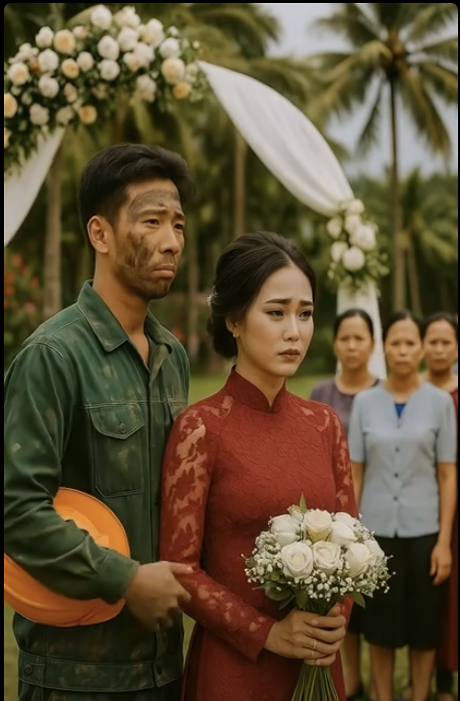 Chú rể mới là Hải, anh thợ xây trong làng — chân chất, đen nhẻm, nghèo kiết xác, từng âm thầm thích Mai từ thuở nhỏ. Ai cũng tưởng cô điên. Nhưng đám cưới vẫn diễn ra — gấp gáp, đơn sơ, không sính lễ, không váy cưới lộng lẫy, chỉ có mấy bó hoa đồng nội và tiếng cười gượng của cô dâu.