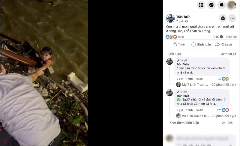 Khoảnh khắc ứng cứu nhanh chóng được phát trực tiếp trên mạng xã hội với dòng thông báo: “Con nhà ai mọi người share cho em với, em mới vớt được ở sông Hàn!”.