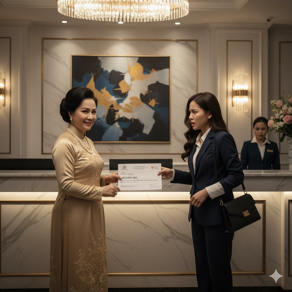Cả sảnh im phăng phắc. Nhân viên lễ tân cũng lúng túng. Mặt bà Lành đỏ bừng, giọng nghẹn lại:
