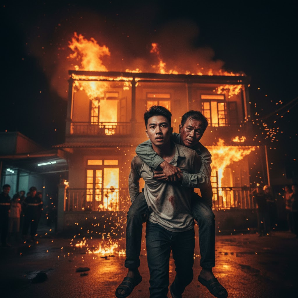Khói cay xè mắt, hơi nóng táp vào da, nhưng Minh chỉ tập trung vào tiếng rên rỉ của người bị nạn. Cậu tìm thấy một người đàn ông trung niên, đang bị một thanh gỗ lớn đè lên chân. Bằng sức lực của một đứa trẻ quen với lao động vất vả, Minh cố gắng hết sức nâng thanh gỗ lên, rồi cõng người đàn ông ra ngoài an toàn.