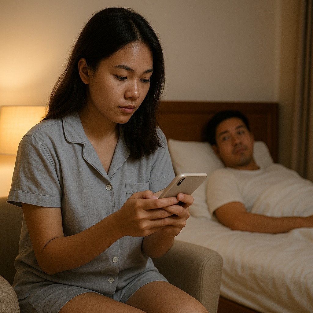Bên cạnh anh, vợ anh – Thảo – vẫn đang thức. Cô nằm nghiêng, ôm chiếc điện thoại trong tay, khuôn mặt hắt lên thứ ánh sáng xanh dịu. Thảo bấm máy rất khẽ, tưởng anh ngủ rồi. Nhưng Hưng không ngủ say đến thế.