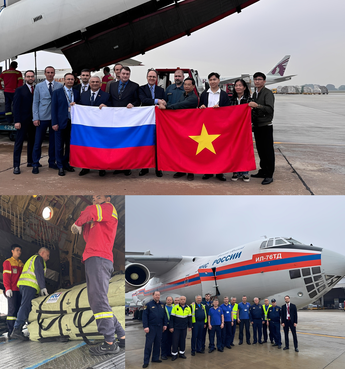 6h35 hôm nay, chuyên cơ số hiệu SUM 9121 của Bộ Phòng vệ dân sự, Tình trạng khẩn cấp và Khắc phục hậu quả thiên tai Liên bang Nga đáp xuống sân bay Nội Bài mang theo 29 tấn hàng viện trợ.