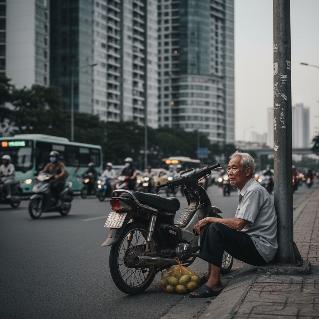 Đến nơi, ông choáng ngợp trước tòa nhà cao sừng sững, cửa kính sáng loáng. Ông Tư ngập ngừng dắt xe vào cổng. Nhưng chưa kịp hỏi thăm, anh bảo vệ trẻ tuổi đã phóng mắt nhìn ông từ đầu đến chân: áo bà ba bạc màu, dép nhựa, chiếc xe cà tàng xịt khói.