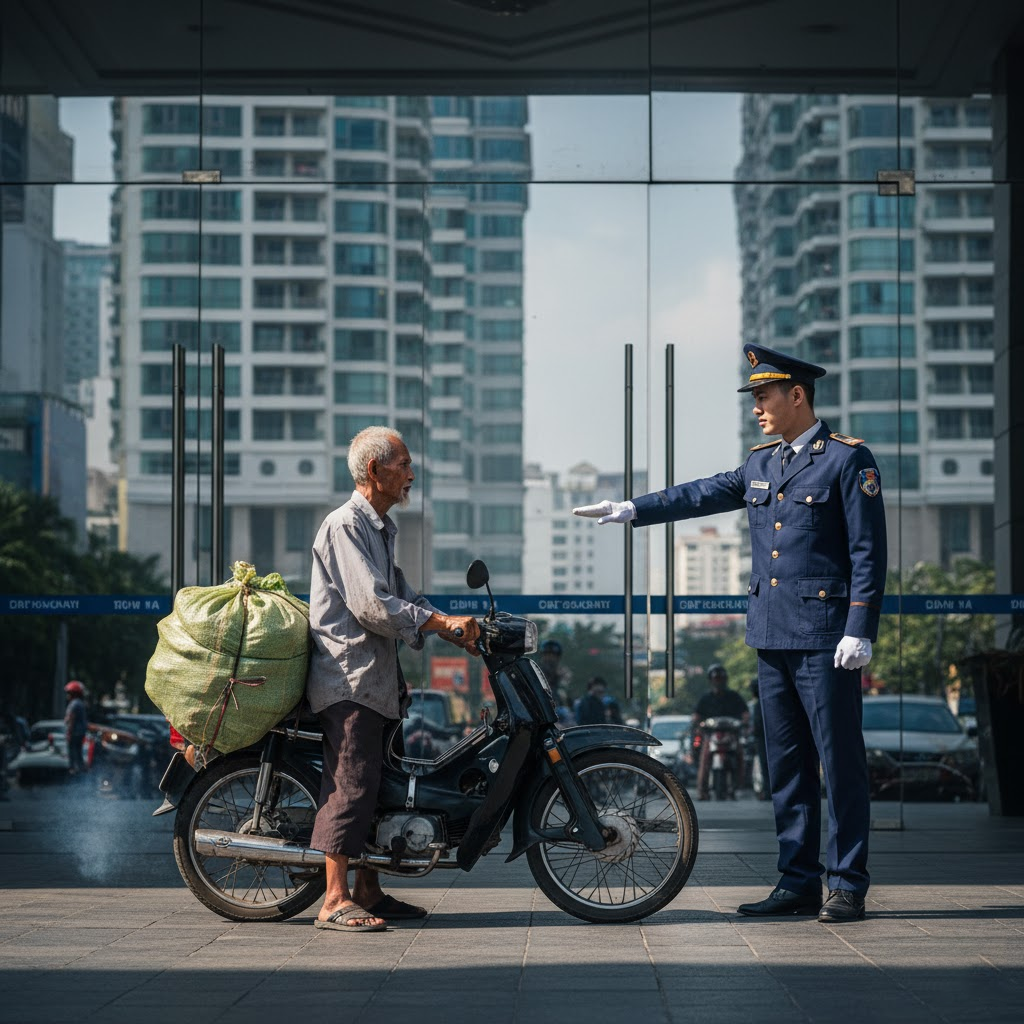 Đến nơi, ông choáng ngợp trước tòa nhà cao sừng sững, cửa kính sáng loáng. Ông Tư ngập ngừng dắt xe vào cổng. Nhưng chưa kịp hỏi thăm, anh bảo vệ trẻ tuổi đã phóng mắt nhìn ông từ đầu đến chân: áo bà ba bạc màu, dép nhựa, chiếc xe cà tàng xịt khói.