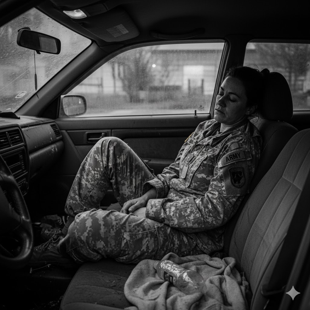 The spiral was rapid and brutal. Unable to maintain payments, she lost her small apartment. Her shelter became a beat-up sedan parked on the edge of a shopping center parking lot. This decorated veteran, who fixed multi-million dollar war machines, was now forced to ration gas to stay warm on cold nights.