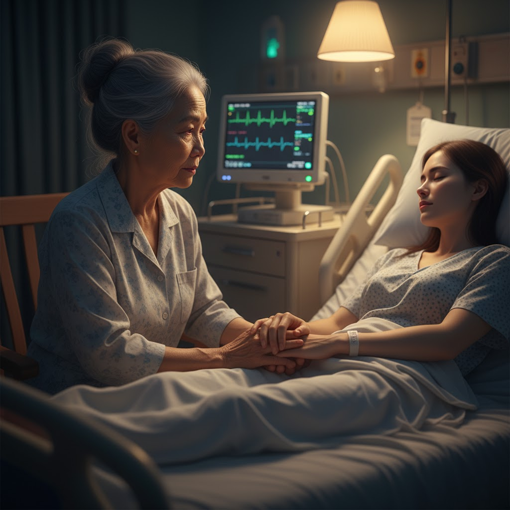 Tại phòng cấp cứu, mẹ đứng đó, mắt luôn dõi theo tôi. Qua cửa kính, ánh đèn vàng từ phòng khách lọt vào, như một cảnh tượng cách biệt giữa hai thế giới: một là tiếng cười, một là sự sống.