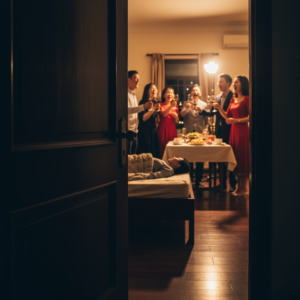 Tôi muốn bật dậy đi ra hiệu thuốc, nhưng chân mềm nhũn, vừa đặt xuống sàn đã ngã quỵ. Trong đầu tôi chỉ có một ý nghĩ: “Nếu hôm nay tôi ngất đi trong căn nhà này, liệu có ai để ý hay họ vẫn sẽ tiếp tục nâng ly cười nói?”