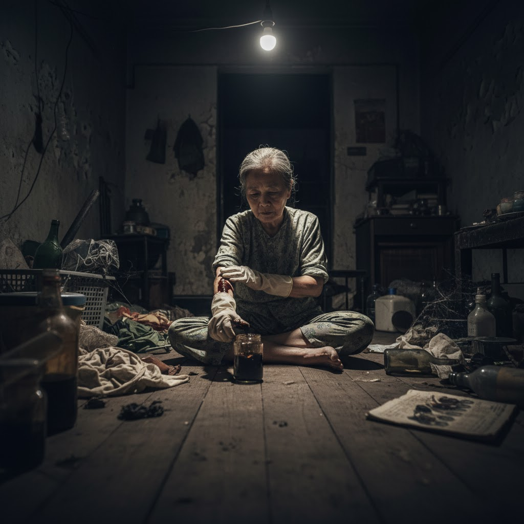 Nỗi nghi ngờ trong tôi càng lớn. Tôi lén đặt một camera nhỏ ngoài cửa phòng bà. Hai ngày sau, khi kiểm tra lại, tôi sững sờ: Trong clip, mẹ chồng ngồi giữa phòng, mở tủ gỗ, bên trong là những chiếc lọ thủy tinh chứa chất lỏng đỏ sẫm. Bà dùng găng tay, đổ từng ít ra bát, rồi thoa lên người! Tôi hoảng loạn. Không biết đó là gì – thuốc? Hay… máu?