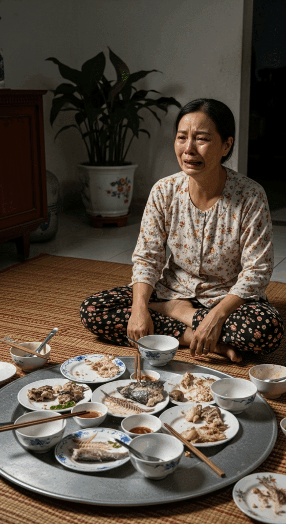Tuấn ngồi đó, nhìn cảnh ấy, trong lòng dậy lên một nỗi nghẹn. Anh bỗng nhận ra — lần nào về cũng thấy vợ ăn sau cùng, và lần nào cũng là mấy món thừa nguội ngắt.